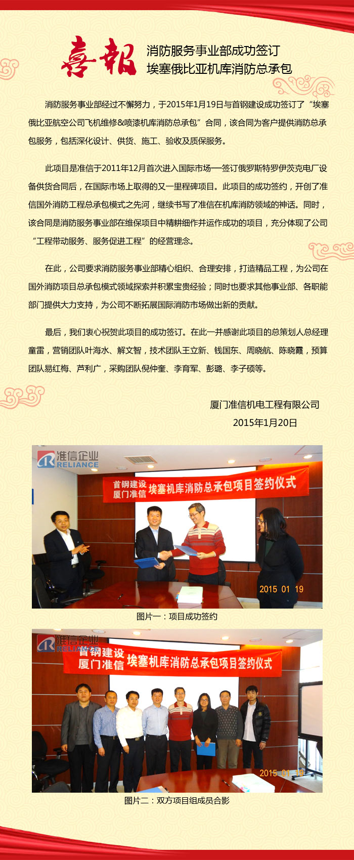 首页 » 新闻资讯 » 新闻中心 » 喜报—消防服务事业部成功签订埃塞俄比亚机库消防总承包