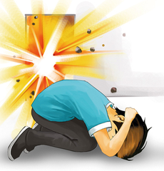 爆炸产生的冲击波会释放巨大能量,可能直接对肢体和内脏造成挤压、震损。室内爆炸时,这种力量尤其强,甚至强到会直接造成死亡。自救的第一步就是“趴下”——保持身体伏低不但可以最大程度降低爆炸所带来的伤害,还可以防止吸入过多有毒烟雾,爬下时,最好找到遮挡物,或趴在桌下、墙边等地点;同时,需要背对爆炸点,双手护住后脑和脖子,紧闭双眼,并张大嘴巴减少冲击波对鼓膜的伤害,也应尽量远离门窗、管道口、沟渠的前后及其附近,减少因冲击波造成的物体碎片飞溅伤害。